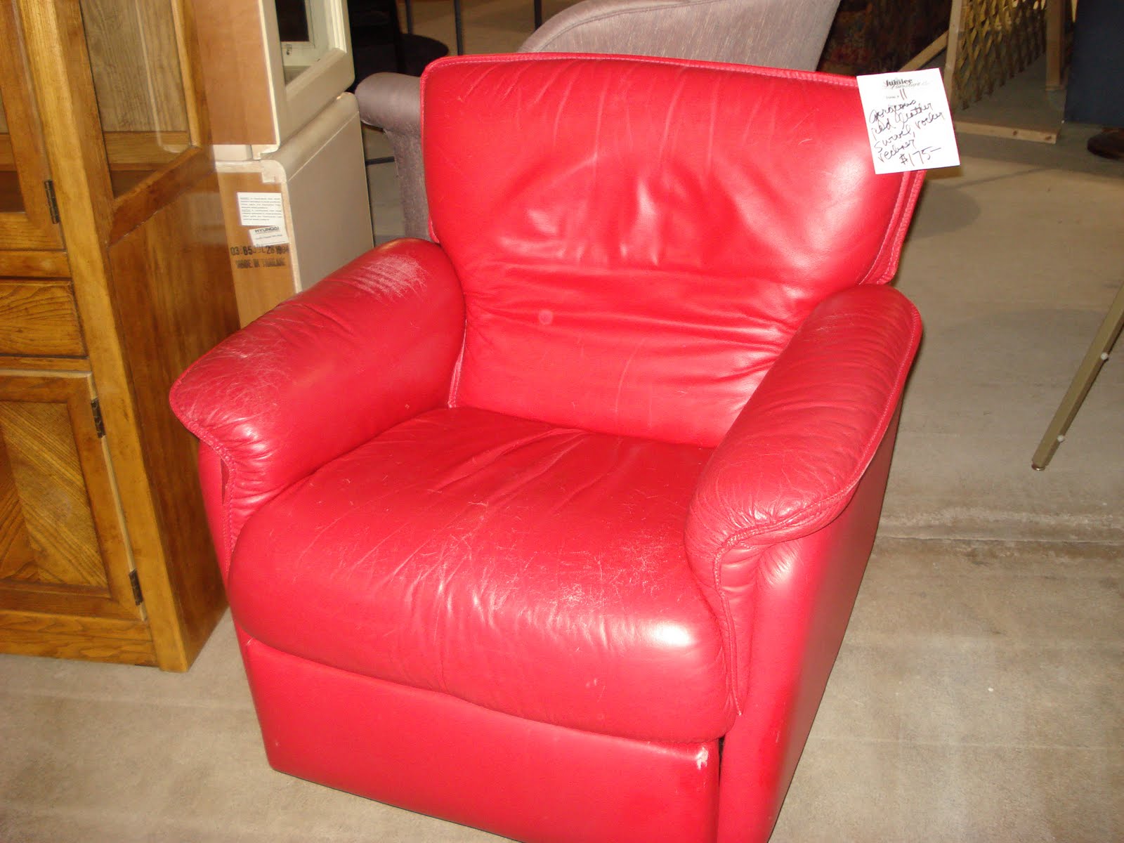 I shouldn't have had my flash on when I took this photo because the chair isn't as red as it looks - regardless this is an ah-mazing swivel, rocker, recliner in red leather with a small head rest that you can pull up to make sure you're super comfy and 100% relaxed - what other chair can do all that and for the low, low price of $175?!